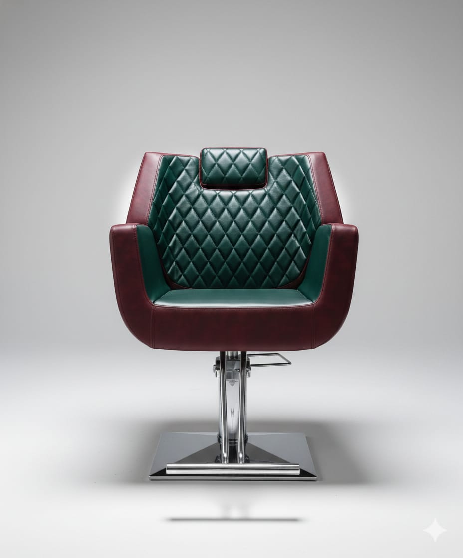 The chair is supported by a strong chrome base that ensures stability and durability, while the 360° swivel rotation allows easy movement during salon treatments. The unique green and maroon upholstery combination adds a luxurious and eye-catching look, making it perfect for premium salon interiors.